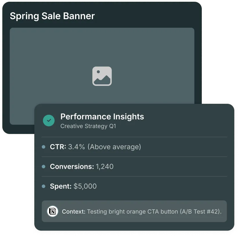 Performance data and the creative decisions that drove it surface together, not in separate tools weeks apart.