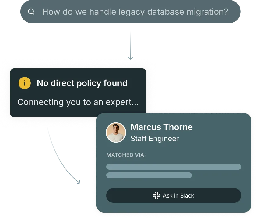 Employees find the right expert without knowing the org chart or who owns what.