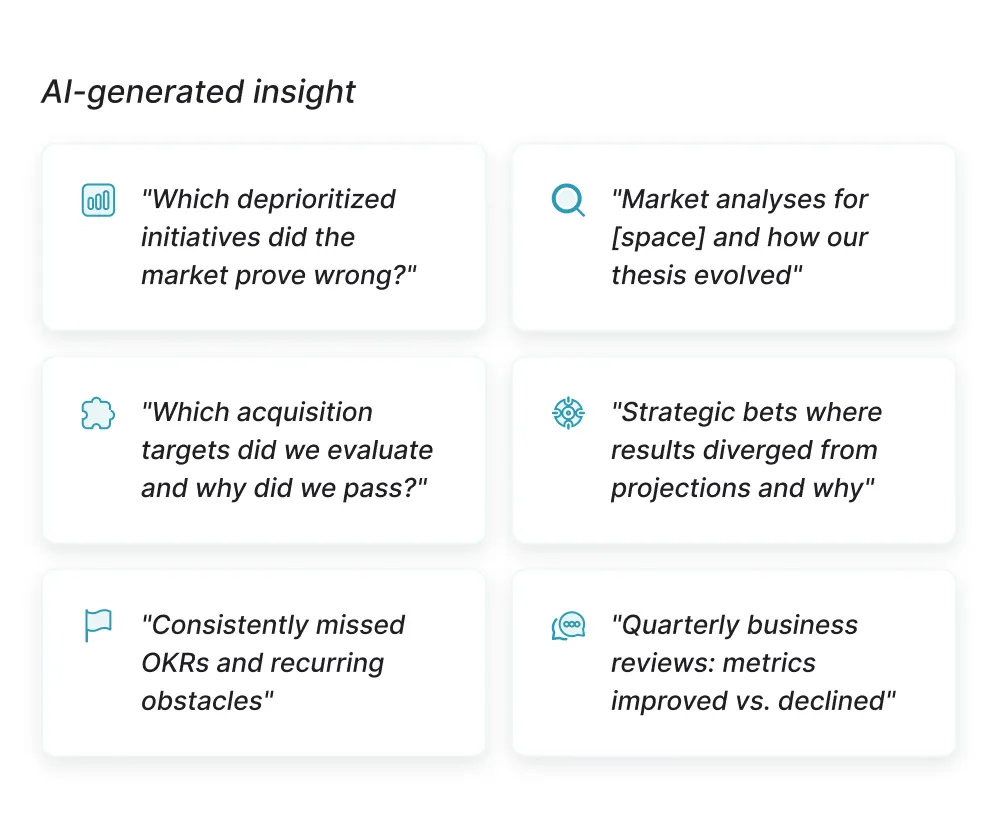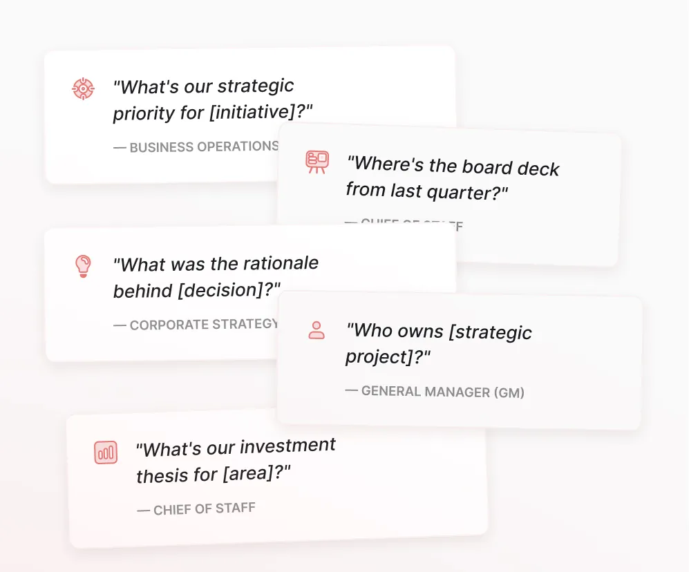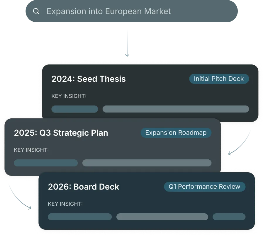 Every strategic artifact from seed-stage ideas to last quarter's board deck surfaces in a single search.