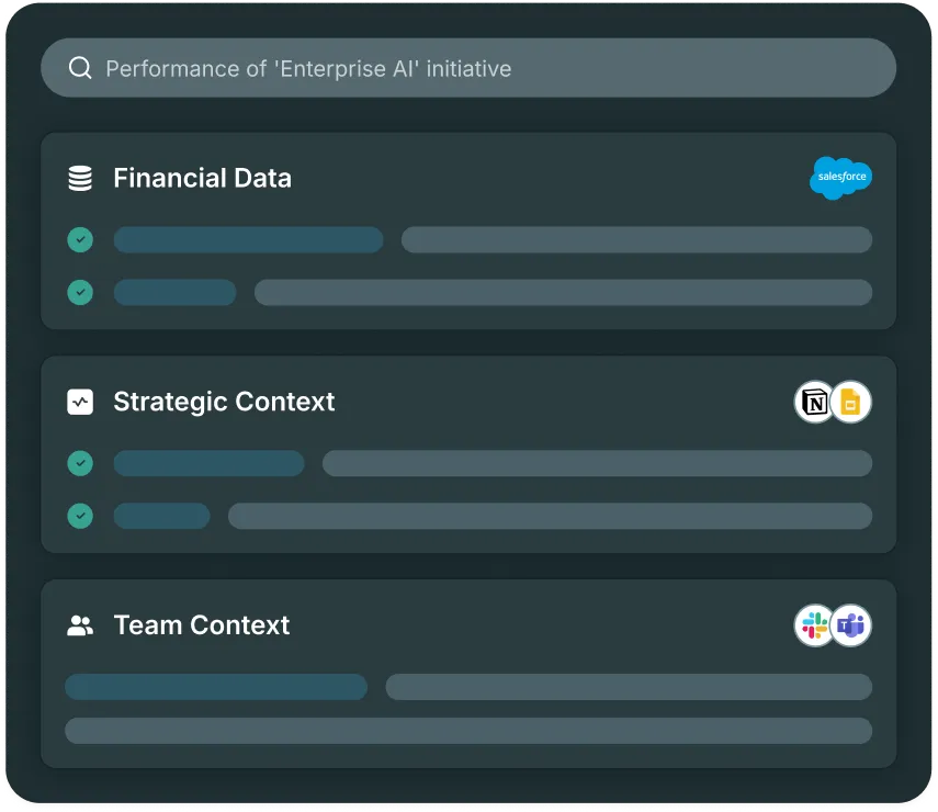 A board question about a specific business line can pull from ERP data, team discussions, and the original initiative brief together.