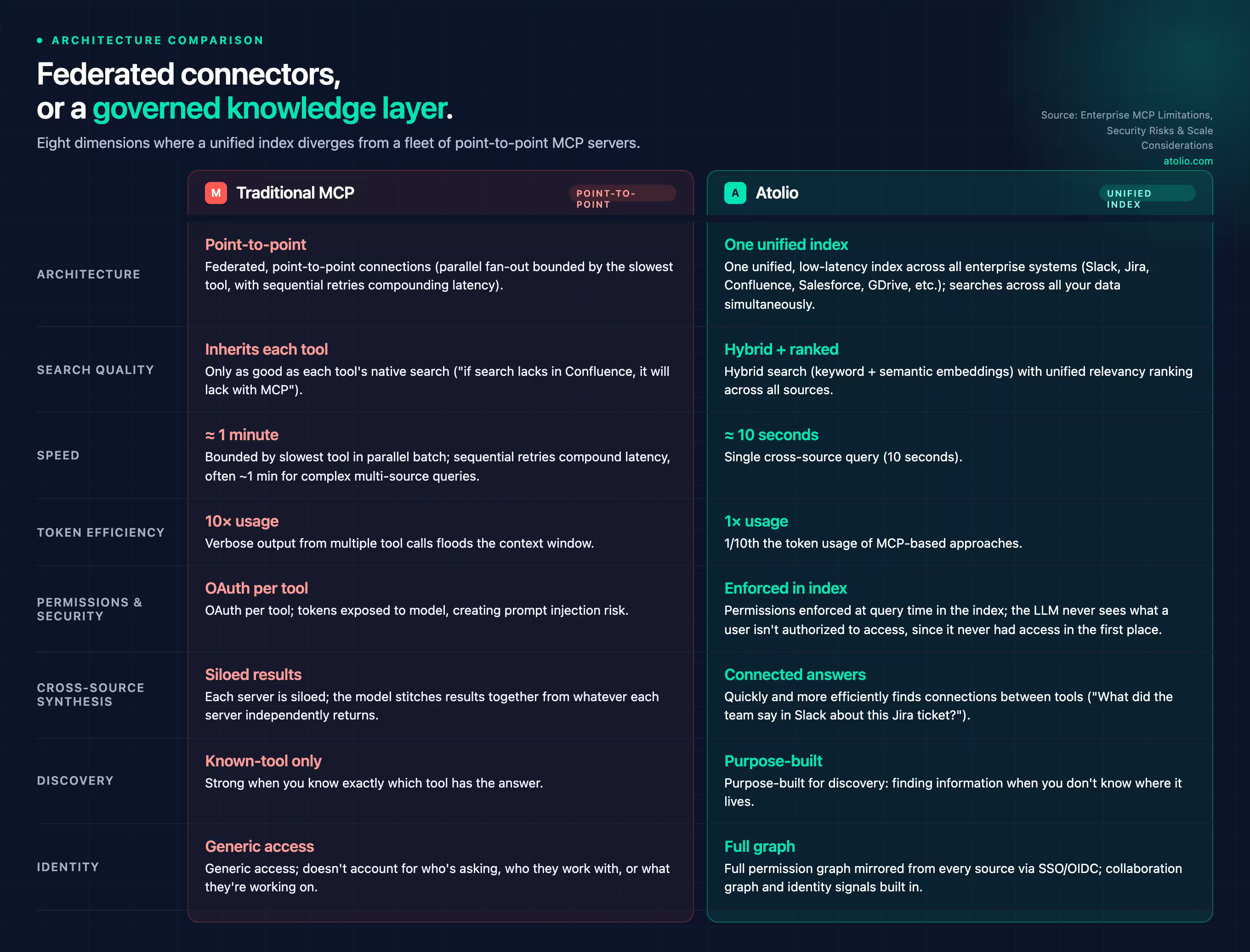 On performance: the reason Atolio returns cross-source results in roughly 10 seconds versus a minute for comparable MCP queries is not clever caching. A purpose-built, low-latency index designed to search across all your data simultaneously is structurally faster than sequential federated API calls bounded by the slowest tool’s response time. And because Atolio applies unified relevancy ranking across all sources through its own index – rather than passing queries to each tool and stitching back whatever they return – the results reflect what’s actually most relevant, not whatever each tool’s individual search engine happened to surface.