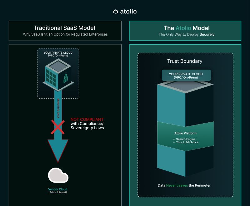 Before writing a line of code, Atolio spoke with 762 enterprises across regulated industries. The finding was consistent: any AI solution that touches sensitive internal data – CEO communications, unfiled patents, product roadmaps, client PII, clinical records – has to stay entirely within the client's environment.