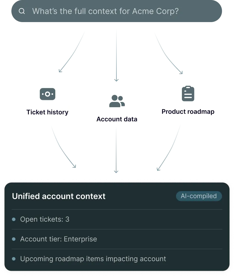 Seamlessly compile ticket history, account data, and product roadmap docs